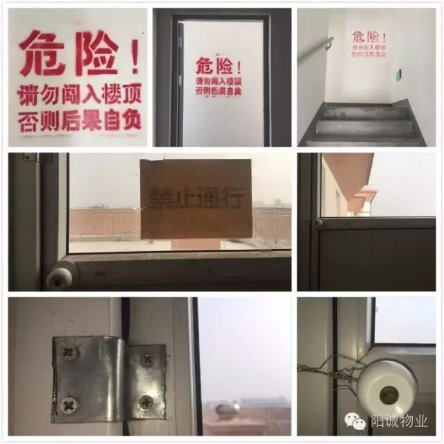 物業(yè)公司工作人員已在各樓通往樓頂的頂層樓道墻明顯位置噴上了“危險!請勿闖入樓頂,否則后果自負”的警示標語,并將樓頂門上鎖封閉,且工作人員會定期巡查樓頂門鎖閉情況,請務必告知及教育自家小孩,切勿強行破壞門鎖,闖到樓頂平臺、排風口、二層平臺、各樓層窗戶等部位逗留玩耍,以免意外發(fā)生。同時也請您為了他人的安全,不要擅自撬開樓頂門鎖。